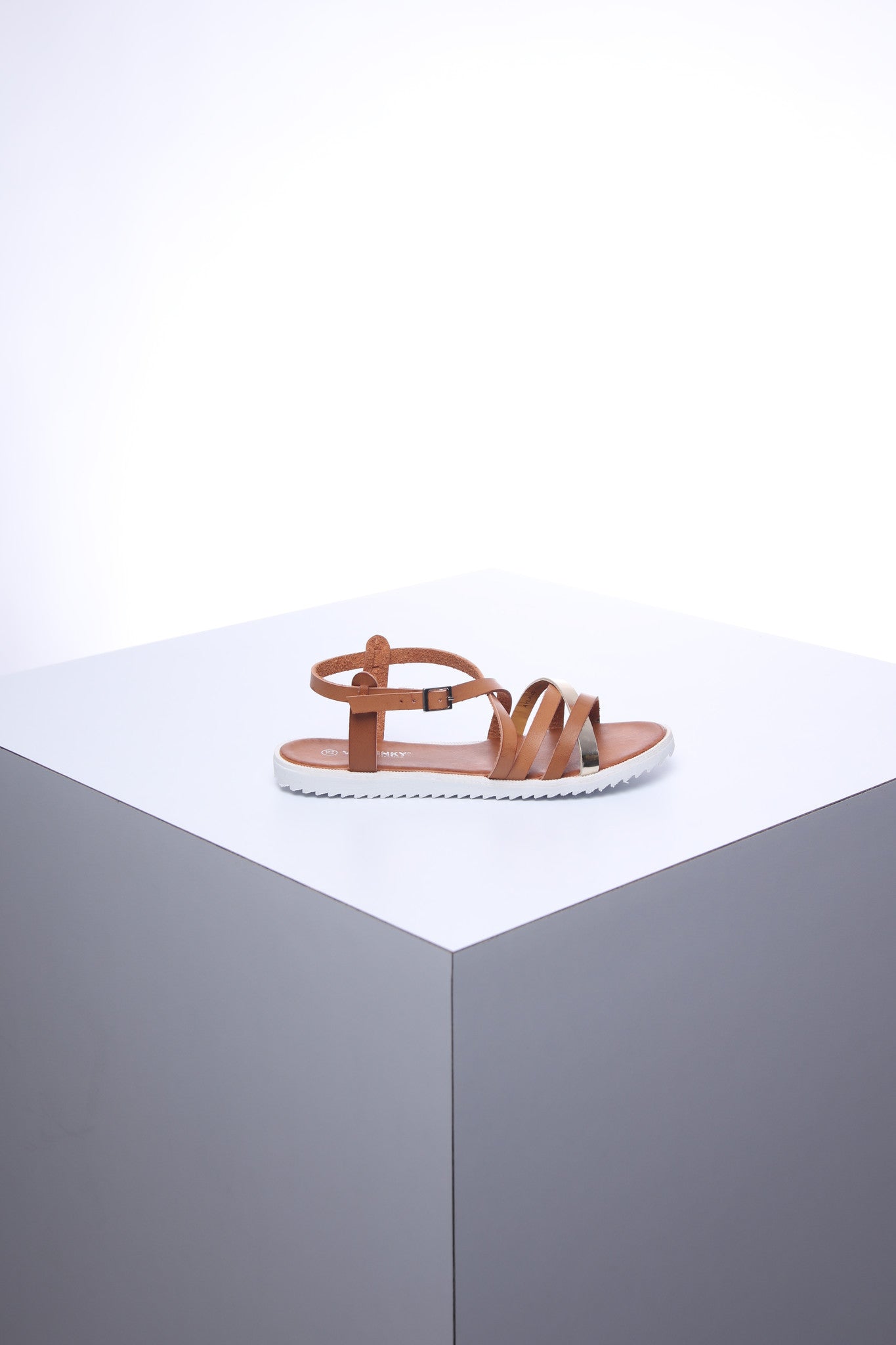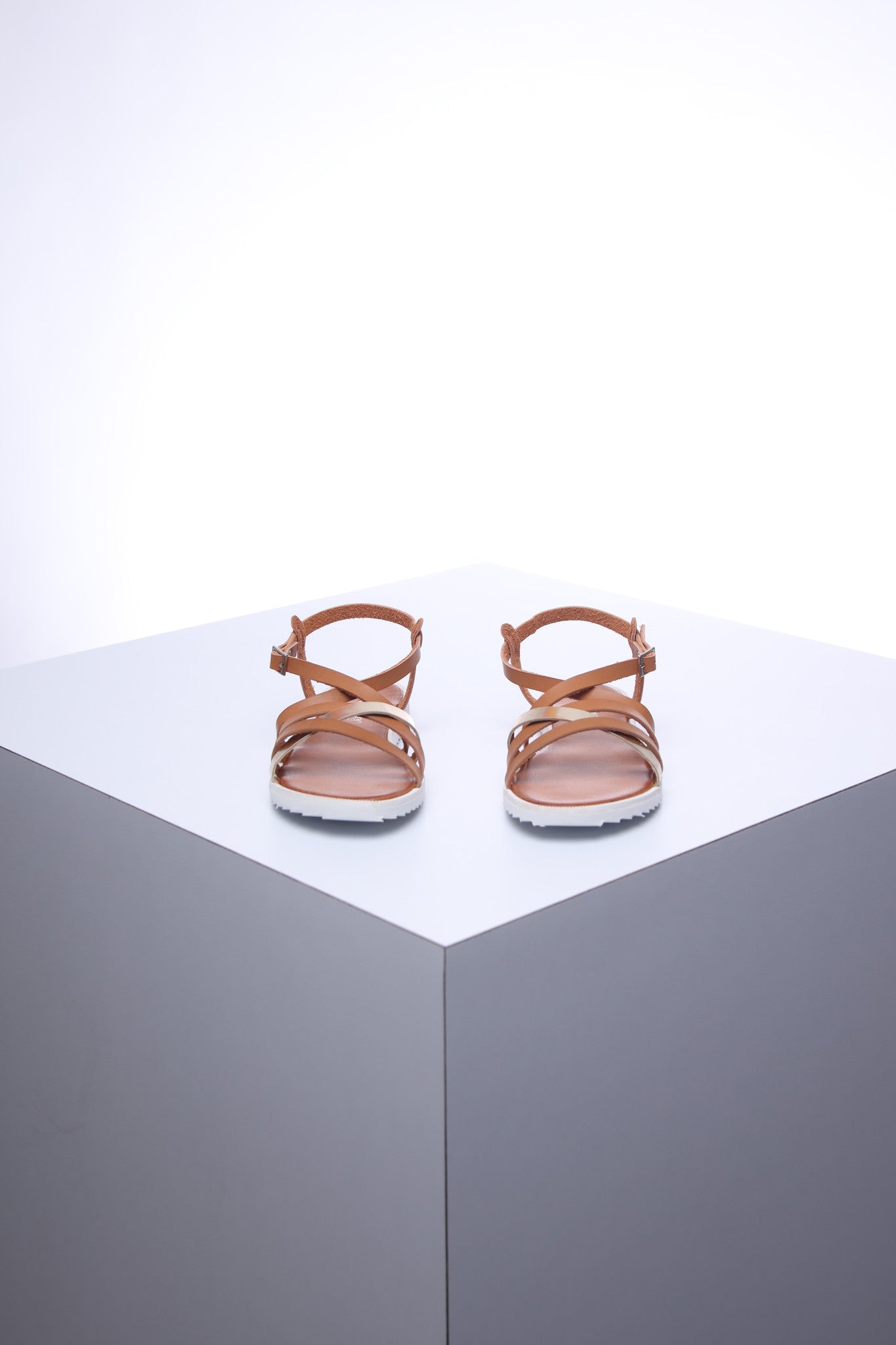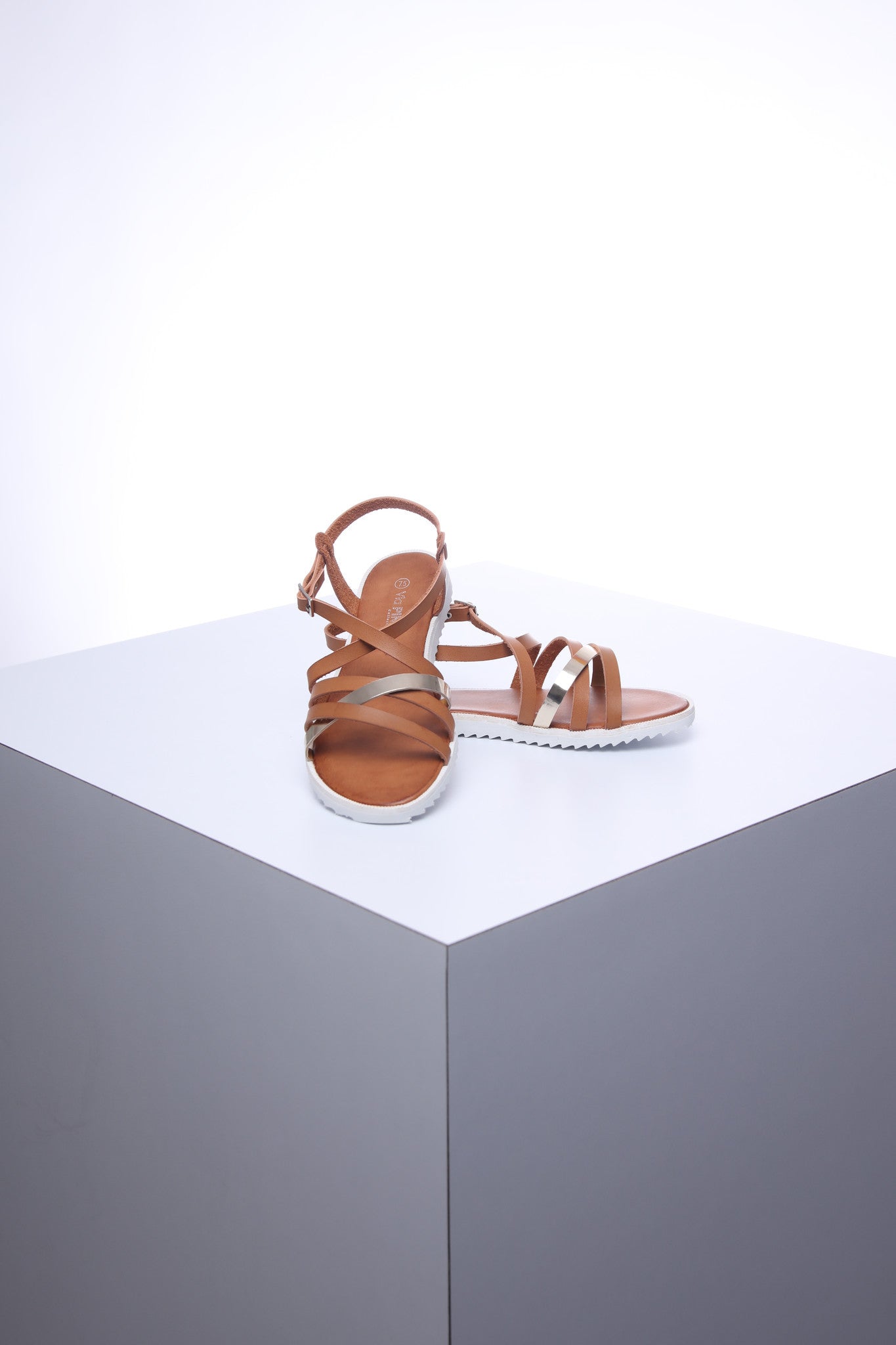 סנדלים המשלבות בדיוק מושלם בין חום לזהב, עשויות רצועות דמוי עור בלוק וינטאג'י עם סולייה לבנה לתוספת אדג'.